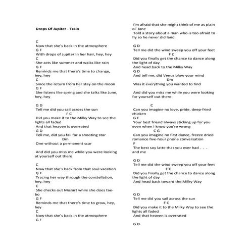 Web Verse 1 C Now that shes back in the atmosphere G F With drops of Jupiter in her hair hey hey hey hey C She acts like summer and walks like rain G F Reminds. With G drops of Jupiter in her hair hey F hey hey hey. She acts like summer and walks like rain.